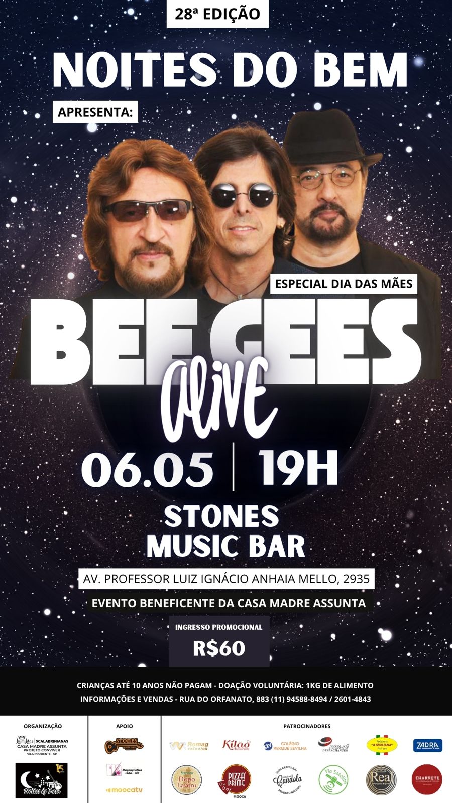 Acontecerá no dia 06 de maio a 28ª edição do “Noites do Bem”, espetáculo beneficente em prol da Casa Madre Assunta, que terá como atração a banda Bee Gees Alive.